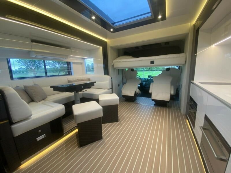 5 chevaux, rampe latérale et arrière, double pop-out, pop-up, cave sous l’appartement, compartiments de rangement autour du camion, groupe électrogène diesel 6 KW, 550 litres d’eau douce, 300 litres d’eaux usées, 5-6 lits, salon, lit extra large au-dessus de la salle de bain, porte d’entrée arrière, vidéo surveillance et contrôle de température pour le compartiment à chevaux,