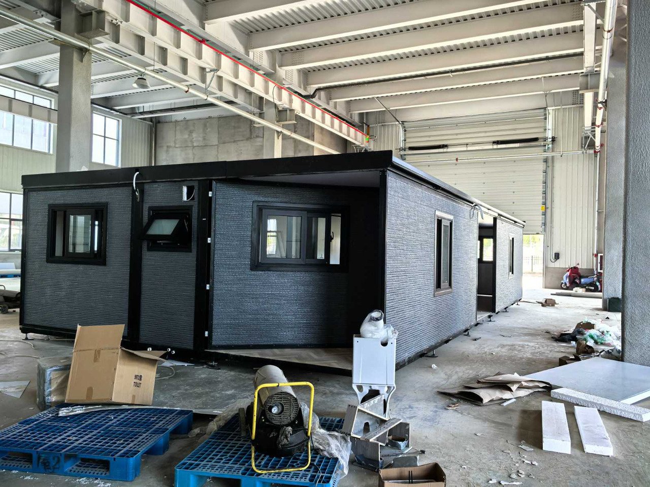 Equipé de murs et d’un toit isolés ; 3 pièces fermées (chambres) ; coin cuisine avec placards au-dessus ; armoire à compteur ; salle de bain avec toilettes et douche à effet pluie ; lavabo avec armoire de toilette et robinetterie de toilette ; sol en vinyle ; système de ventilation ; points de connexion pour l’éclairage de plafond (y compris les plafonniers) ; cadres en plastique avec double vitrage ; canal de drainage ; plateau; l’eau, l’électricité et le drainage peuvent être facilement connectés est préparé ; verrouillable avec clé et cylindre à bouton ; y compris les plafonniers, les prises et les interrupteurs ; dimensions plié 11900x2150x2550 mm (dimensions de transport) ; Les dernières photos sont de l’intérieur mais avec des portes noires, une douche noire, une cuisine noire et un sol à chevrons
