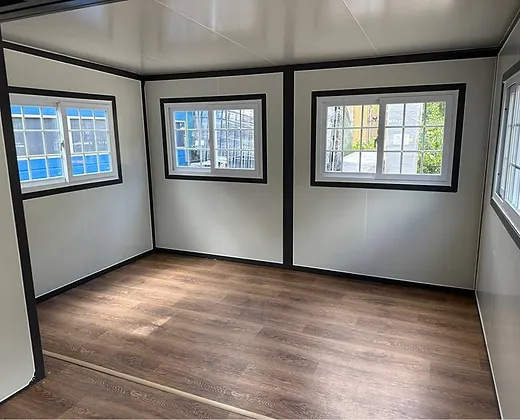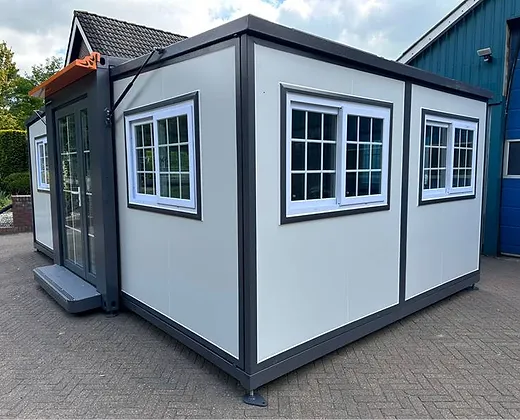 Toilettes: oui; poids individuel: 3350 kg; longueur totale: 5860 mm; largeur totale: 6220 mm; hauteur totale: 2550 mm; description: Equipé de murs et de toiture isolés; salle de bain avec WC et douche; lavabo avec armoire miroir et robinetterie de toilette; plancher de vinyle; système de ventilation (connexion 230V); cadres en plastique avec double vitrage; gouttière de drainage; Bordes; l’eau, l’électricité et le drainage peuvent facilement être connectés est préparé; verrouillable avec clé et cylindre de bouton; dimensions pliées 5860x2110x2550 mm (dimensions transport)