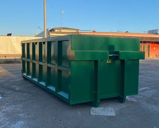 NOUVEAU CONTENEUR ROLL-OFF OUVERT POUR DÉCHETS ENCOMBRANTS À OUVERTURE ARRIÈRE AVEC DEUX PORTES PLIANTES À 3 CHARNIÈRES, LE FOND SUPPORTE LES POUTRES DE 200 MM