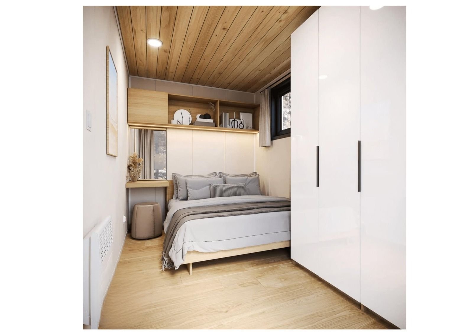 Cette maison modulaire est une maison de 3 chambres avec une salle de bain entièrement équipée avec douche, une cuisine entièrement équipée avec plaque de cuisson/four électrique, réfrigérateur/congélateur et lave-linge/sèche-linge. Le salon comprend des armoires dans chaque chambre et des unités de rangement, avec 2 lits simples et 2 armoires avec unités de rangement.