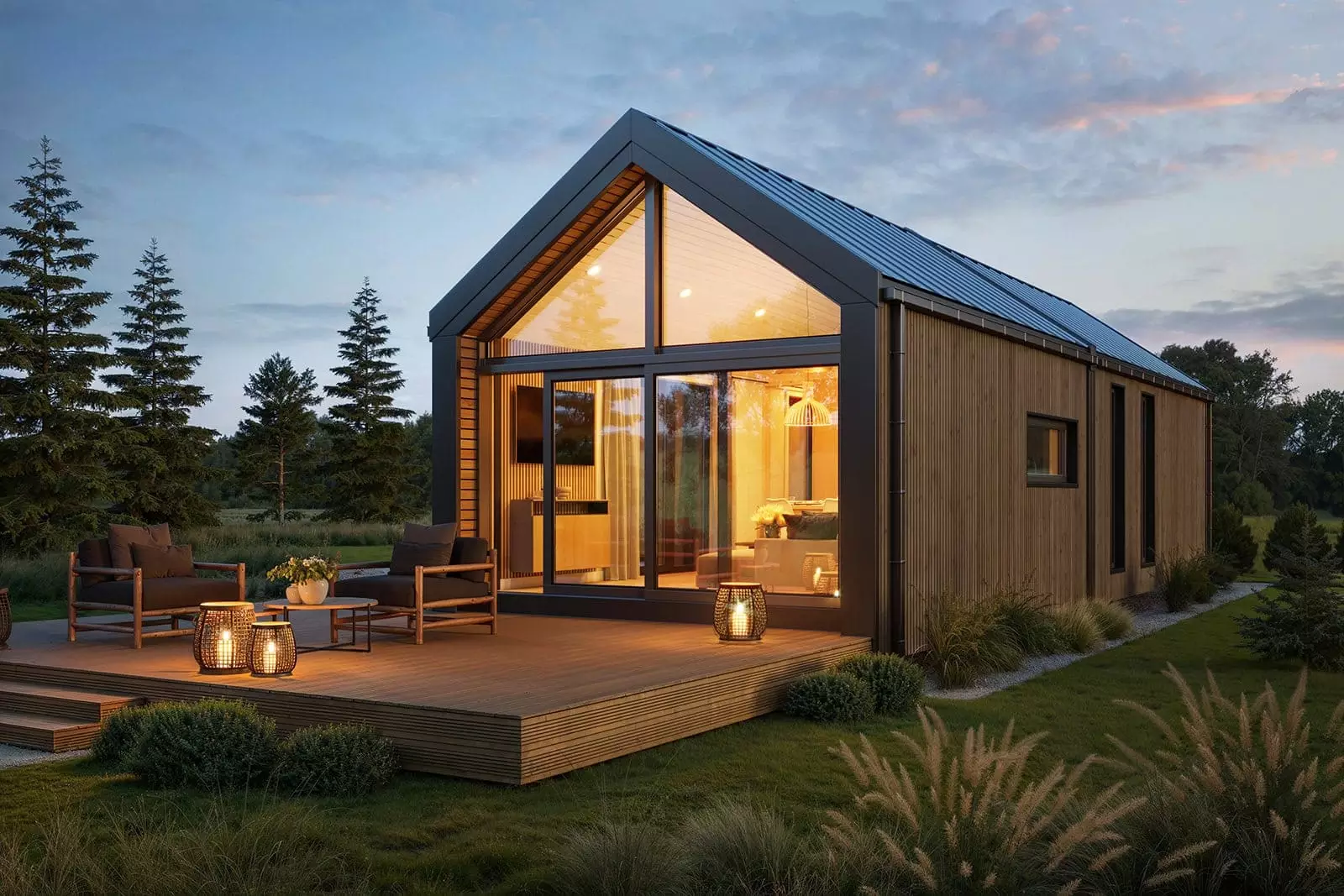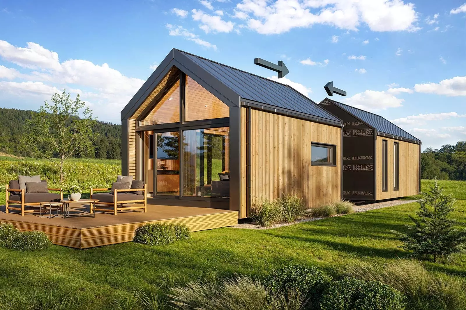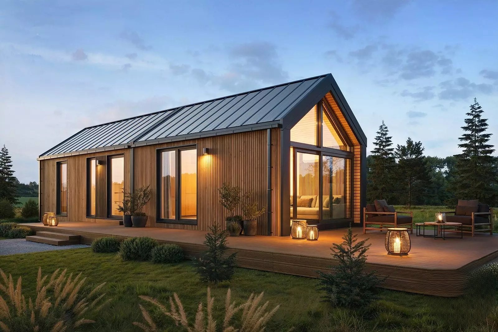 Le sol, les murs et le toit sont isolés thermiquement, étanches à l’humidité et au vent grâce à de la laine minérale, des pare-vapeur et des membranes. Les cloisons assurent une bonne ventilation, une étanchéité à l’air optimale et d’excellentes propriétés de pare-vapeur. L’épaisseur de l’isolation thermique varie selon le type d’habitation choisi (été ou toute l’année). L’isolation des murs extérieurs est réalisée avec 10 ou 20 cm de laine minérale, celle du sol avec 15 ou 20 cm, et celle du plafond avec 15, 20 ou 25 cm. Le sol est recouvert de panneaux structurels de 38 mm et d’un revêtement de sol. Les finitions intérieures des murs et plafonds sont en PVC, panneaux Strama ou Fibo, ou en bois naturel (lames). Les finitions extérieures sont en panneaux muraux Vox Vifront ou Kerrafront, panneaux Vinylit, ou encore en bois naturel (panneaux de façade ou panneaux losanges). La maison peut également être entièrement revêtue de métal (murs et toit d’un seul matériau), de panneaux métalliques ou d’une façade mixte combinant bois et tôle. Toiture : toiture métallique à joints debout ou en panneaux métalliques, dans la couleur choisie par le client. Fenêtres et portes extérieures : fenêtres en PVC à double ou triple vitrage, selon l’usage prévu de la maison. Portes extérieures : portes vitrées en PVC ou en acier plein. Portes intérieures : portes à panneaux DRE ou, sur demande, panneaux vernis hydrofuges.