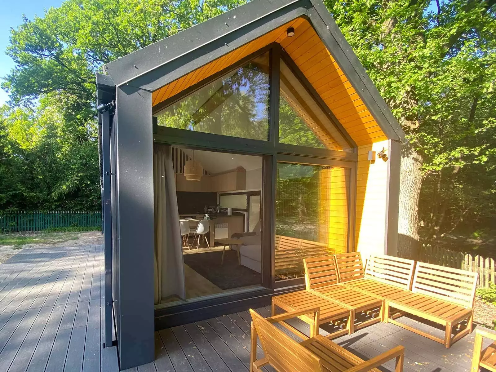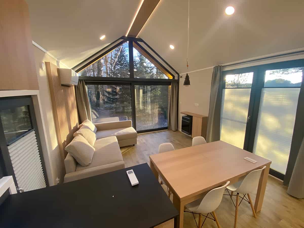 L’intérieur de la maison modèle F3 se compose d’un vaste espace de vie comprenant un séjour, une cuisine en U et un large couloir desservant les pièces, ainsi que des chambres et une salle de bains. Au-dessus des chambres et de la salle de bains, une mezzanine, accessible par un escalier depuis le couloir, surplombe le séjour et se fond avec lui en un seul volume spacieux. La conception fonctionnelle de la maison, avec deux ou trois chambres, offre un confort optimal à une famille de quatre ou cinq personnes, qu’elle soit destinée à une résidence secondaire ou principale. Les hauts plafonds, ouverts jusqu’au faîte du toit, et les grandes fenêtres donnant sur le jardin environnant contribuent à une sensation d’espace et créent une atmosphère unique. (…)