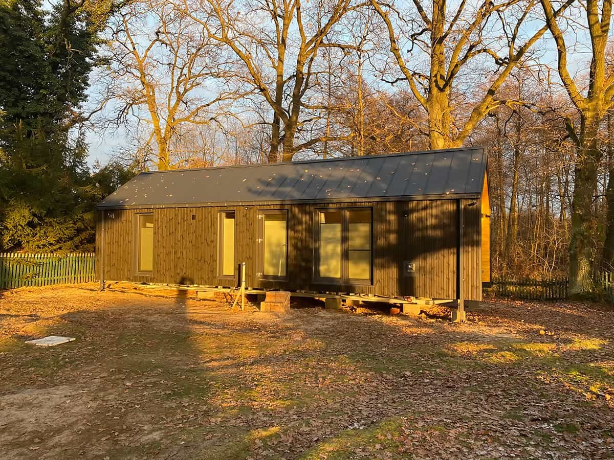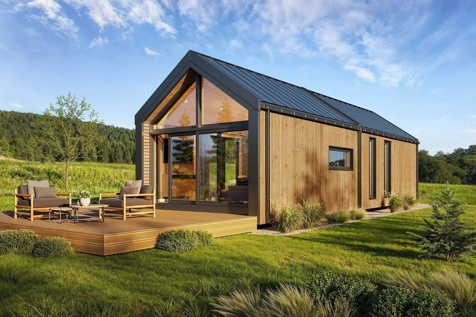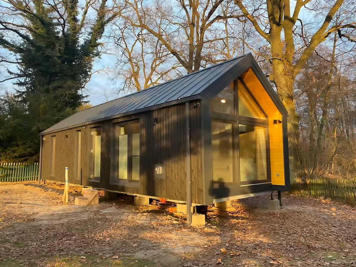 La palette de couleurs de la maison, revêtue de panneaux de façade , est entièrement personnalisable : on peut choisir parmi les teintes bois et anthracite proposées pour les murs de base et la toiture, ou opter pour une palette monochrome graphite et noire. L’aspect des façades extérieures – la disposition des fenêtres , des portes-fenêtres et de la porte d’entrée – est également modulable selon la variante intérieure choisie. Dans la version de base et les variantes 2 et 3, nous proposons une large baie vitrée sur toute la façade pignon, avec portes coulissantes. La maison mobile F3 peut être construite sur châssis mobile (avec roues ) ou sur châssis fixe plus bas (sans roues) . Dans les deux cas, nous recommandons une installation sur fondations ponctuelles . Quelle que soit la configuration du châssis, la maison forme un ensemble compact et se transporte et se déplace aisément.