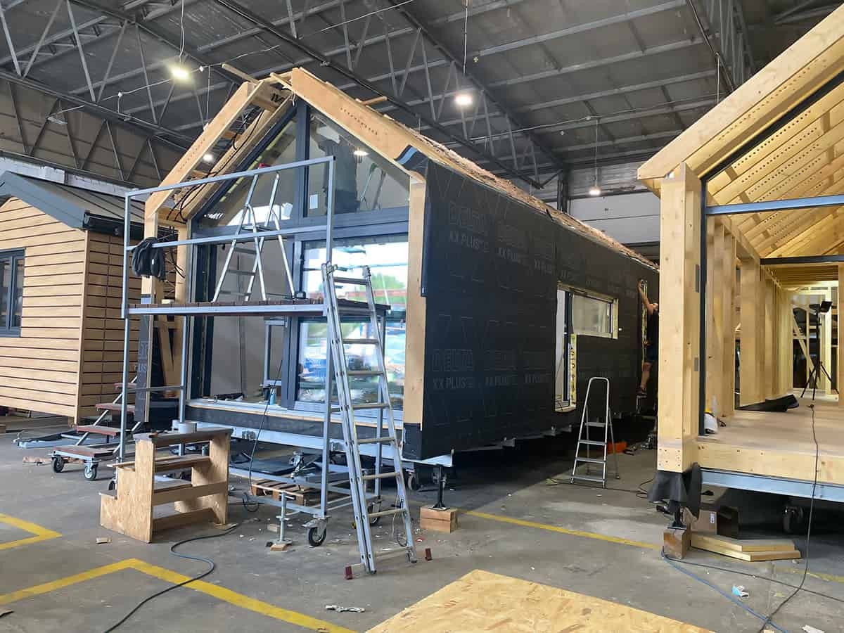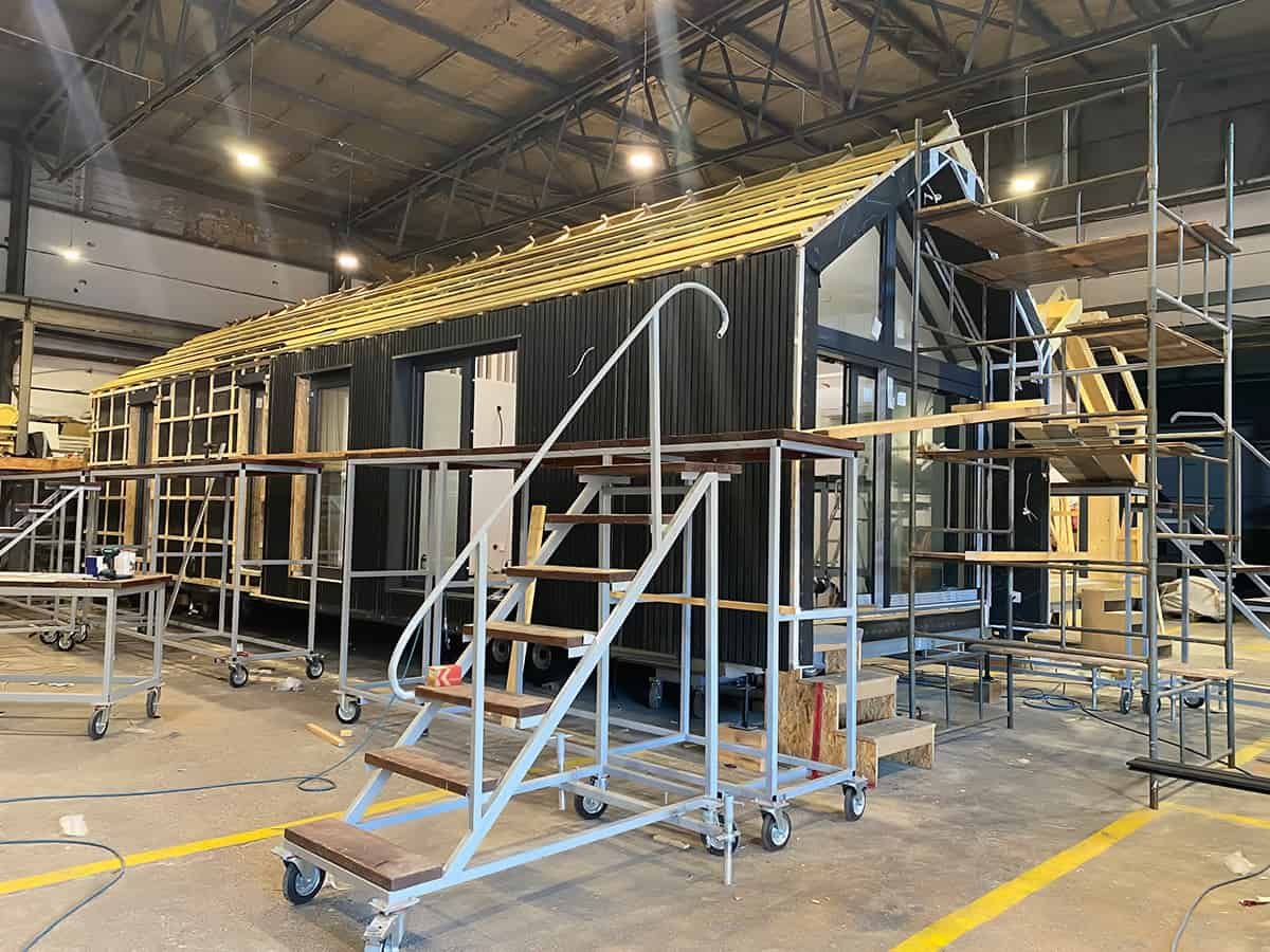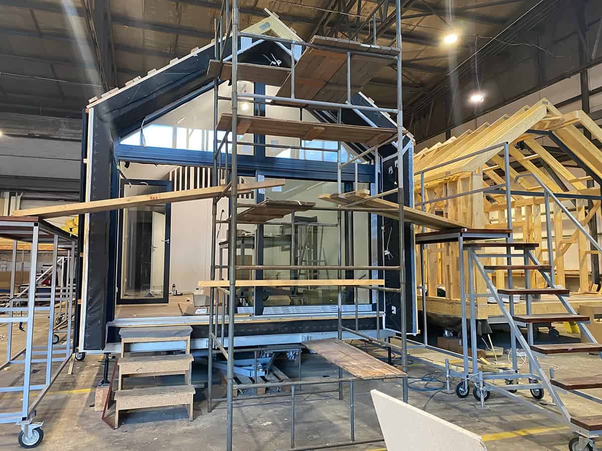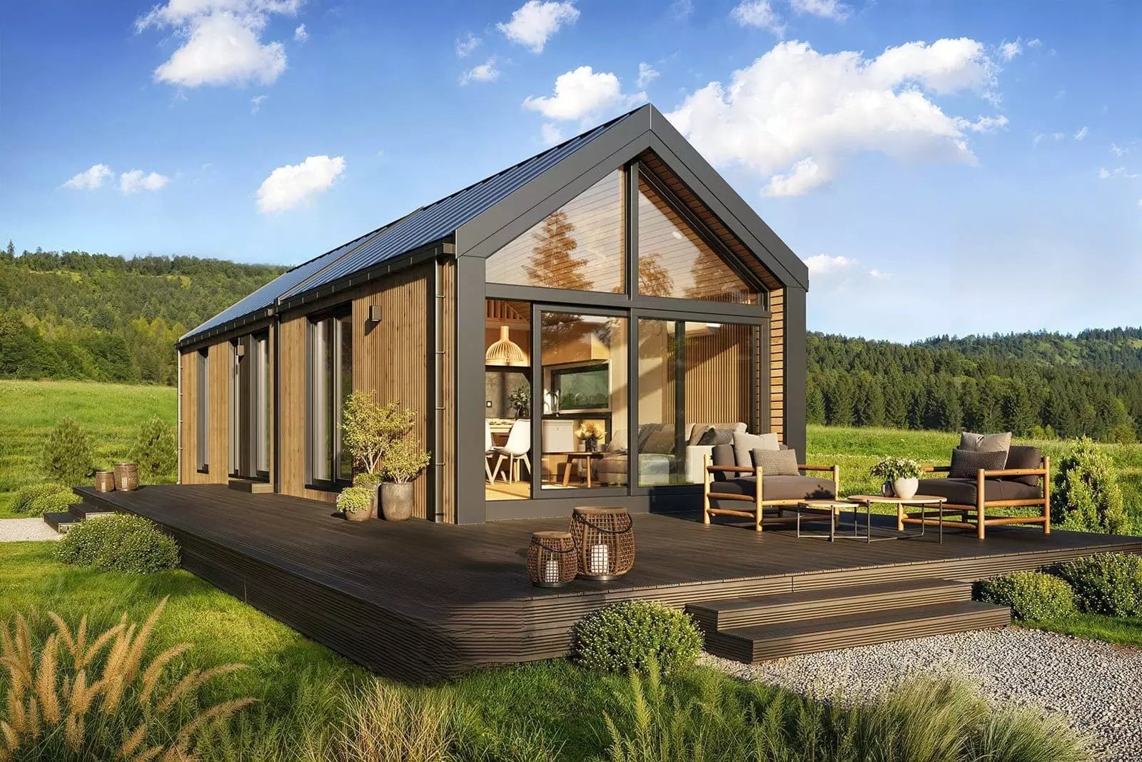La palette de couleurs de la maison, revêtue de panneaux de façade , est entièrement personnalisable : on peut choisir parmi les teintes bois et anthracite proposées pour les murs de base et la toiture, ou opter pour une palette monochrome graphite et noire. L’aspect des façades extérieures – la disposition des fenêtres , des portes-fenêtres et de la porte d’entrée – est également modulable selon la variante intérieure choisie. Dans la version de base et les variantes 2 et 3, nous proposons une large baie vitrée sur toute la façade pignon, avec portes coulissantes. La maison mobile F3 peut être construite sur châssis mobile (avec roues ) ou sur châssis fixe plus bas (sans roues) . Dans les deux cas, nous recommandons une installation sur fondations ponctuelles . Quelle que soit la configuration du châssis, la maison forme un ensemble compact et se transporte et se déplace aisément.