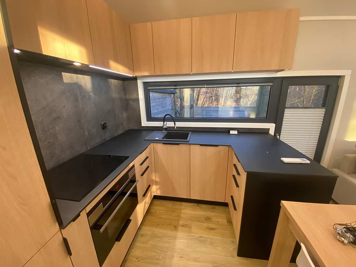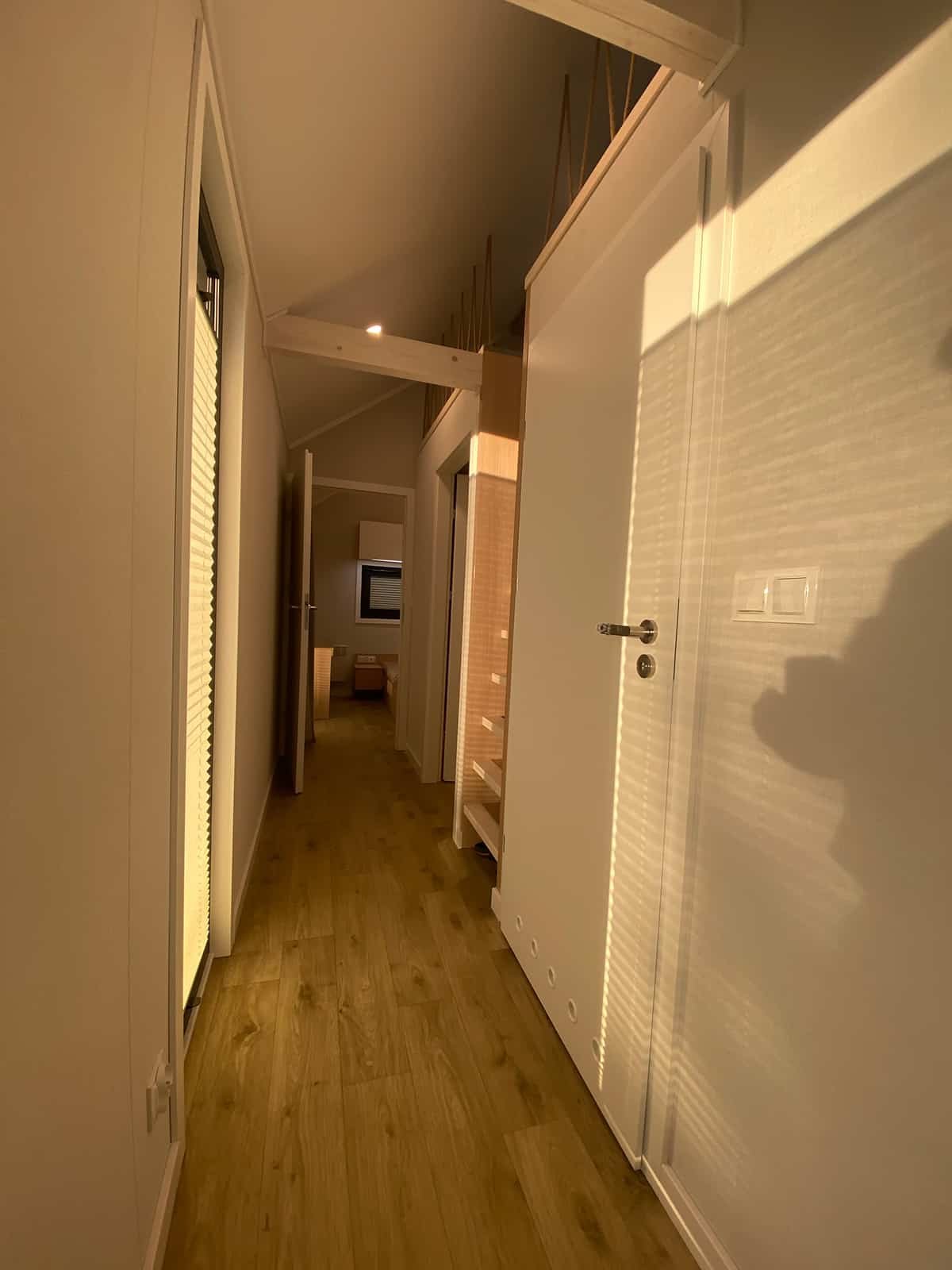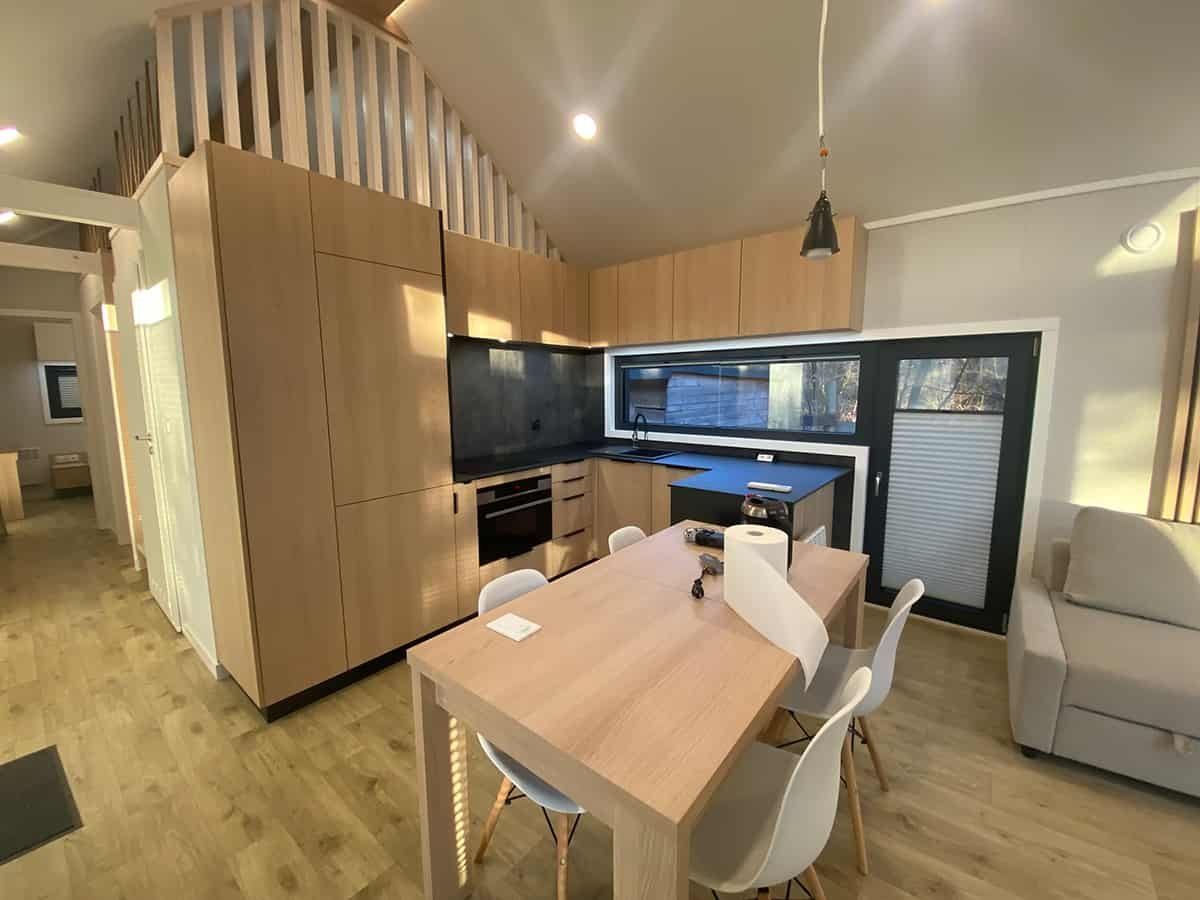 L’intérieur de la maison, quelle que soit la finition choisie, est entièrement fini : murs, plafonds et sols sont revêtus. Les murs intérieurs sont habillés de panneaux PVC ou Strama, ou partiellement de panneaux Fibo (en option). Pour ceux qui préfèrent un intérieur rustique, nous proposons des finitions murales en bois naturel. Les plafonds sont revêtus de panneaux Strama ou, en option, de bois naturel. Les sols de la maison modèle F3 sont recouverts d’un revêtement de sol PVC Lentex haute résistance à l’abrasion. Nous proposons également un revêtement de sol vinyle ou, en option, un parquet stratifié. Dans la version Premium, la maison est entièrement meublée : nous fabriquons nous-mêmes le mobilier, spécialement pour ce projet, dans notre atelier de menuiserie. Le mobilier est réalisé en panneaux stratifiés imitation bois, ou sans finition imitation bois, dans la couleur de votre choix. L’électroménager , les sanitaires et les meubles rembourrés sont disponibles en option, selon les spécifications choisies.