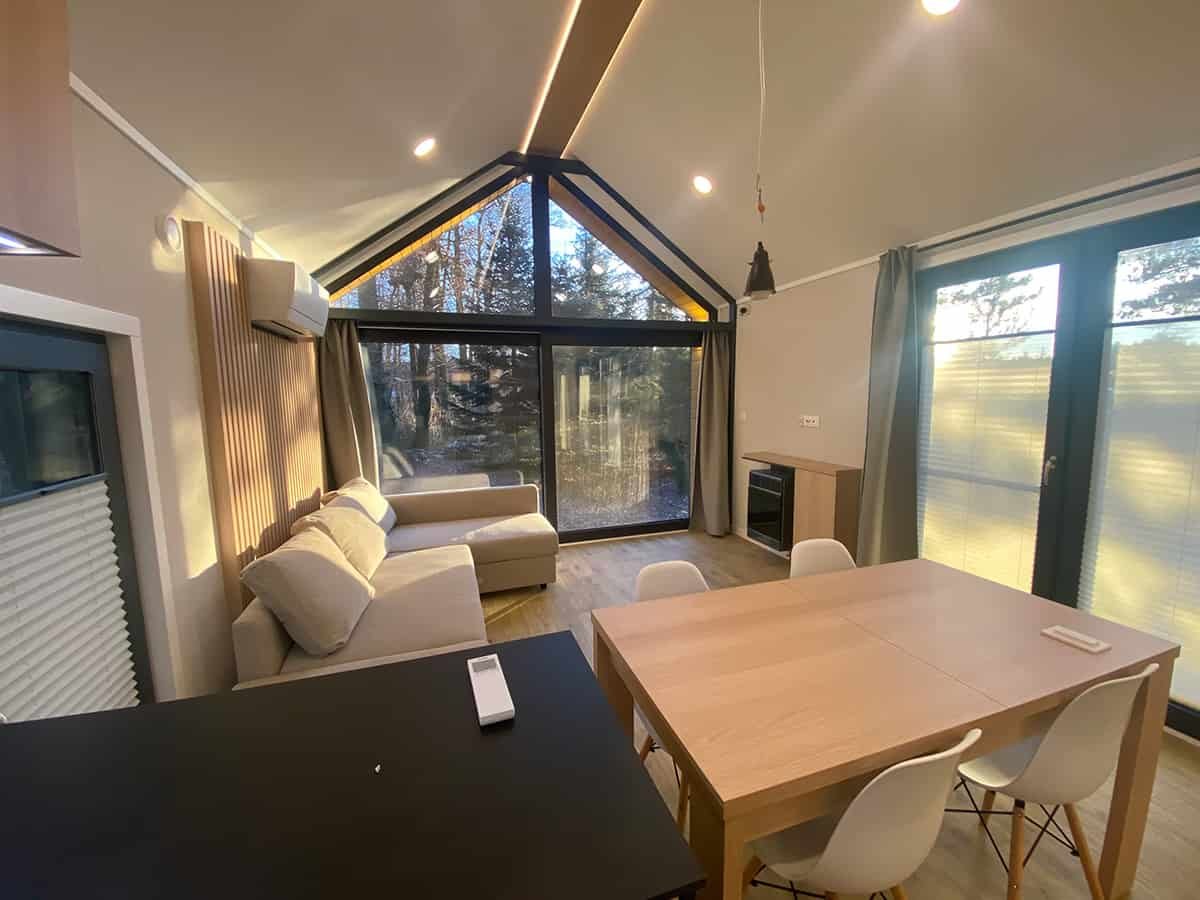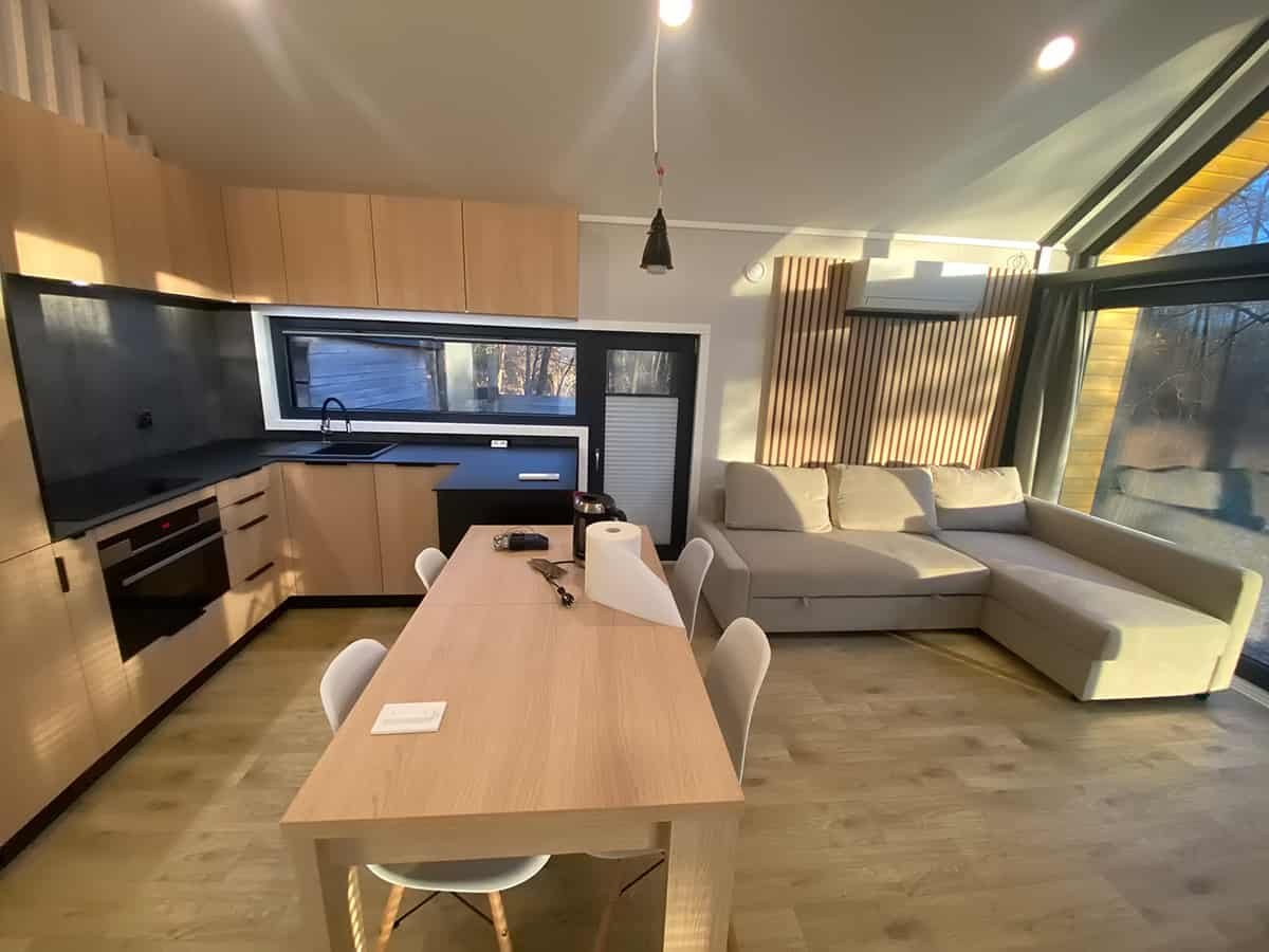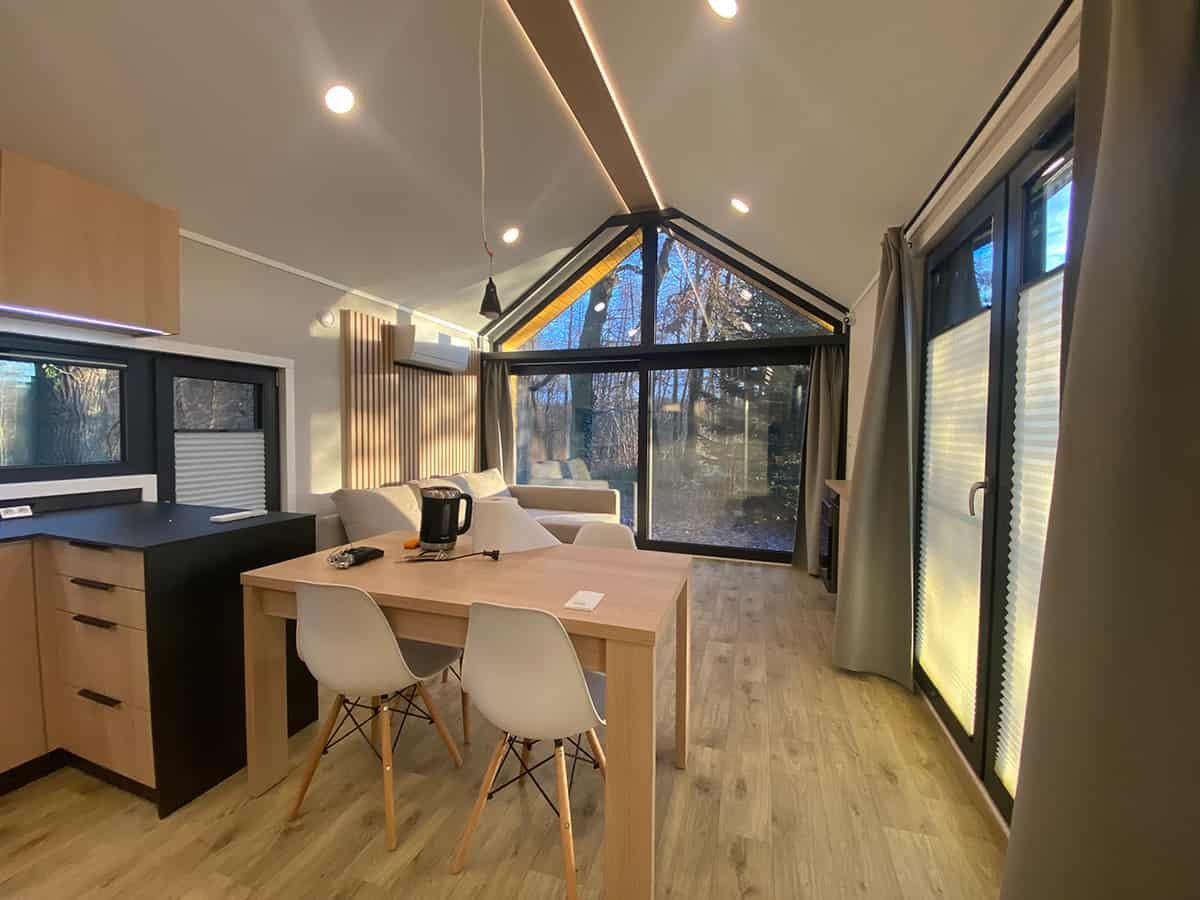 L’intérieur de la maison, quelle que soit la finition choisie, est entièrement fini : murs, plafonds et sols sont revêtus. Les murs intérieurs sont habillés de panneaux PVC ou Strama, ou partiellement de panneaux Fibo (en option). Pour ceux qui préfèrent un intérieur rustique, nous proposons des finitions murales en bois naturel. Les plafonds sont revêtus de panneaux Strama ou, en option, de bois naturel. Les sols de la maison modèle F3 sont recouverts d’un revêtement de sol PVC Lentex haute résistance à l’abrasion. Nous proposons également un revêtement de sol vinyle ou, en option, un parquet stratifié. Dans la version Premium, la maison est entièrement meublée : nous fabriquons nous-mêmes le mobilier, spécialement pour ce projet, dans notre atelier de menuiserie. Le mobilier est réalisé en panneaux stratifiés imitation bois, ou sans finition imitation bois, dans la couleur de votre choix. L’électroménager , les sanitaires et les meubles rembourrés sont disponibles en option, selon les spécifications choisies.