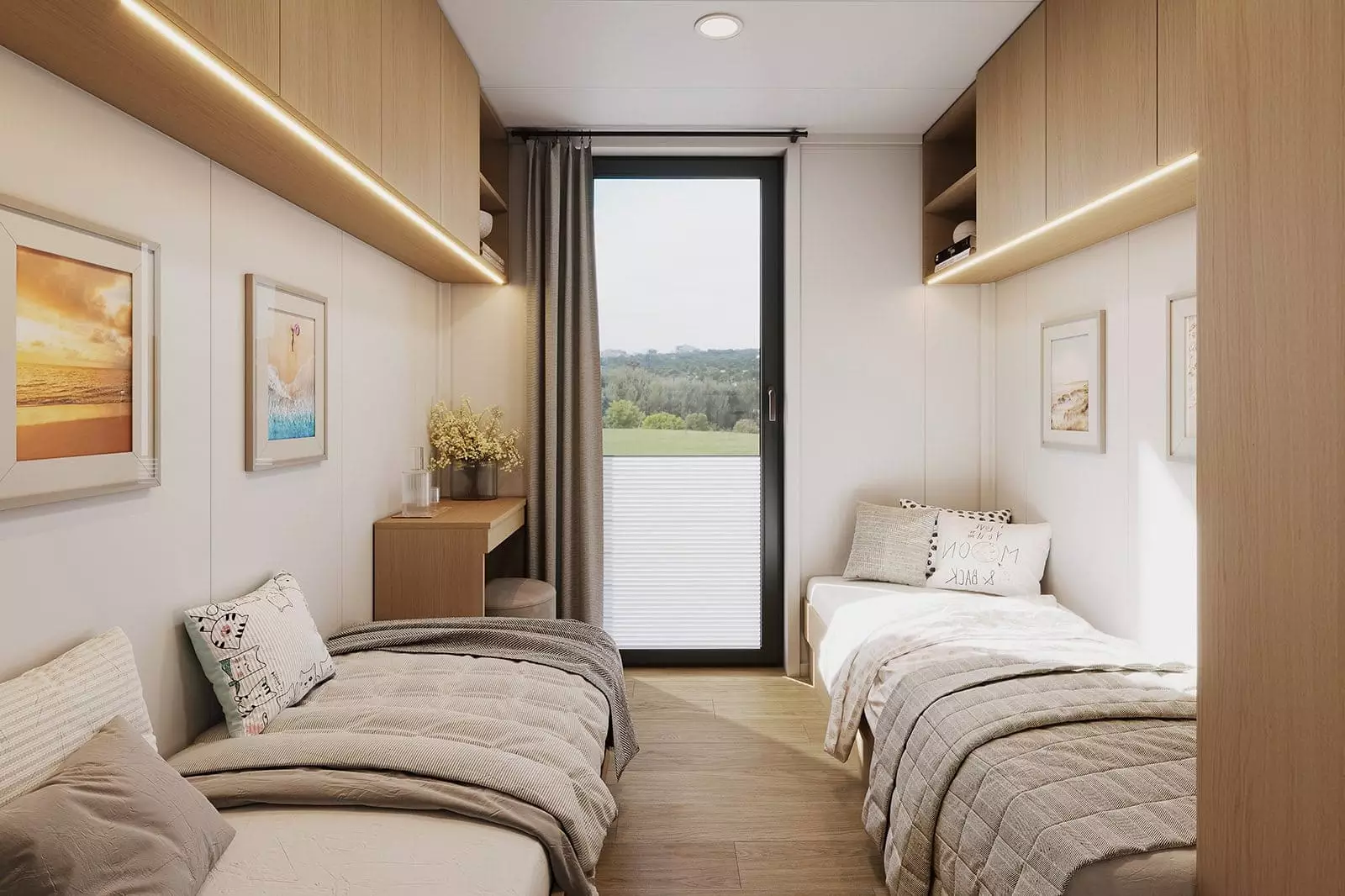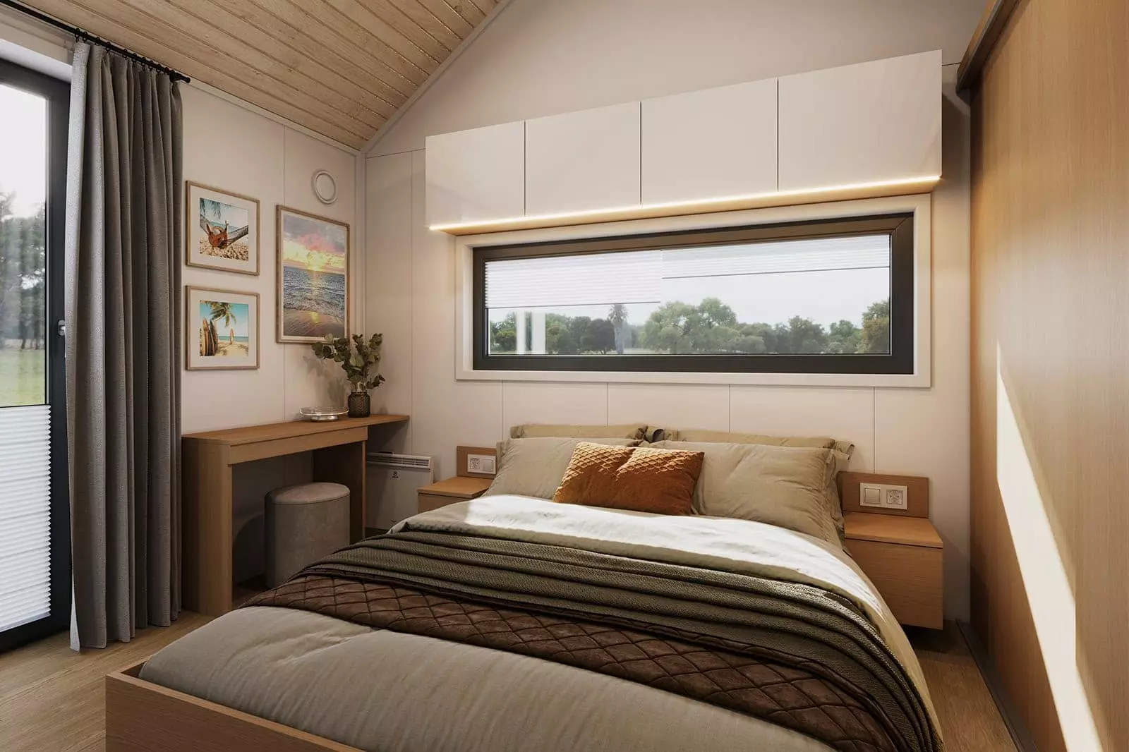 Le mobil-home modèle F3 est disponible en trois variantes d’aménagement intérieur fonctionnel , offrant différentes configurations de pièces et de mobilier. L’extérieur est entièrement personnalisable selon les besoins et les goûts du client. Nous proposons un large choix de couleurs, de matériaux pour les murs et la toiture, ainsi que différentes configurations de fenêtres. La maison est coiffée d’un toit à deux pans incliné à 35 degrés. Cette inclinaison permet d’installer ce modèle dans des zones urbaines où les toitures sont plus hautes et où les maisons à toit plat sont interdites, contrairement à la plupart des mobil-homes.