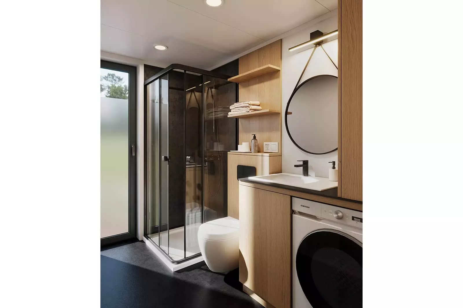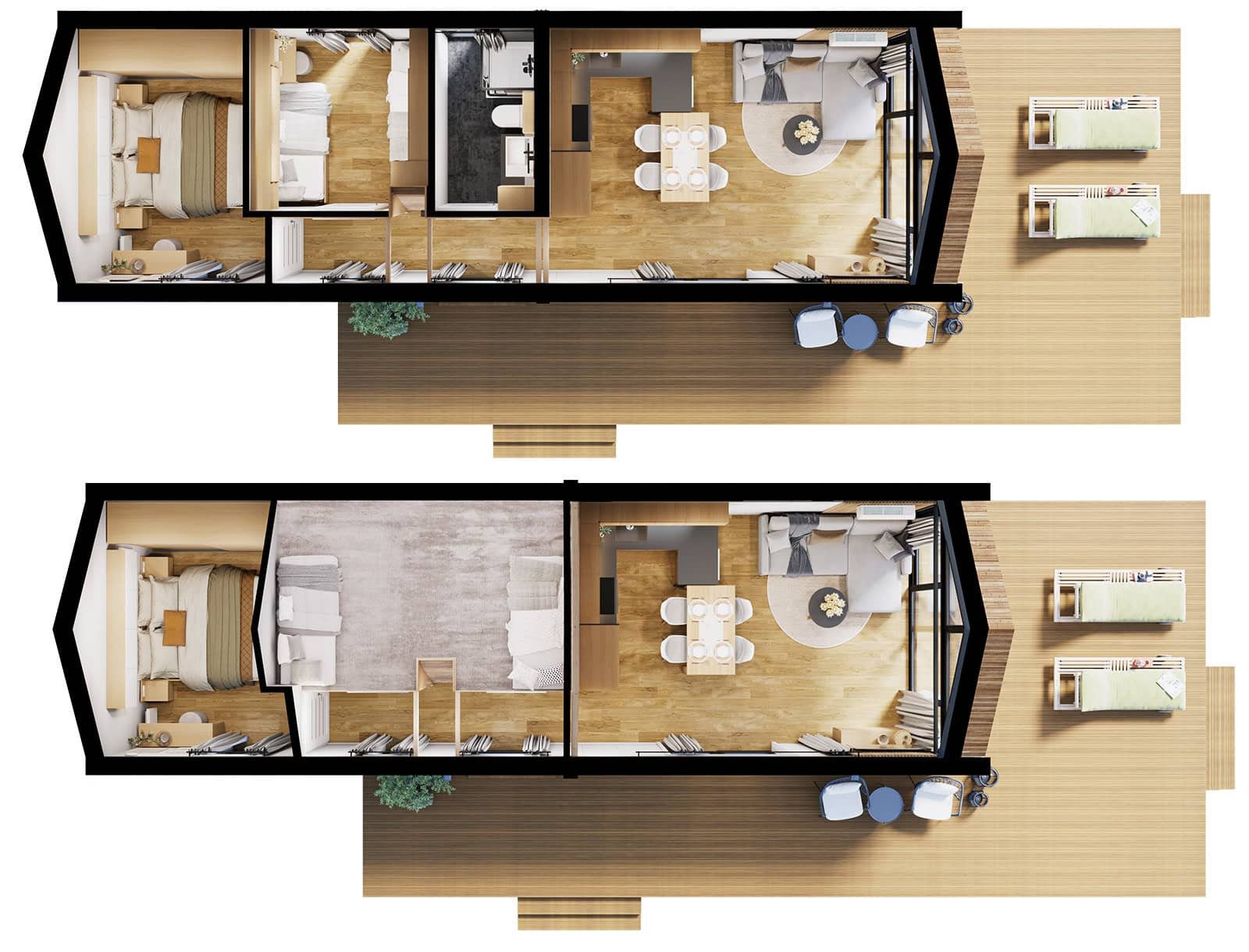Le modèle F3 est actuellement le mobil-home le plus grand et le plus spacieux de notre gamme. Il convient parfaitement comme résidence secondaire, résidence principale ou même maison individuelle pour un usage quotidien. Assemblé à partir de deux modules (deux mobil-homes plus petits) en une seule unité sur le terrain du client, il permet une installation même sur des terrains difficiles d’accès . Son architecture moderne, évoquant une grange traditionnelle , se caractérise par un toit incliné à 35 degrés , une mezzanine surplombant une partie du rez-de-chaussée et un séjour avec une belle hauteur sous plafond. Un élégant pignon vitré ouvre le séjour sur la terrasse et le jardin. L’intérieur, conçu avec soin, est composé de deux modules dont les joints sont invisibles une fois le mobil-home assemblé . L’architecture intérieure associe des éléments en bois à des murs blancs et des touches de graphite. Nous proposons la maison en trois variantes et dimensions extérieures : variante de base 1 ( 13,10 m x 4,2 m) , variante 2 ( 13,5 m x 4,2 m) et variante étendue 3 ( 14,1 m x 4,2 m). Chaque variante dispose de deux ou trois chambres et d’une mezzanine .