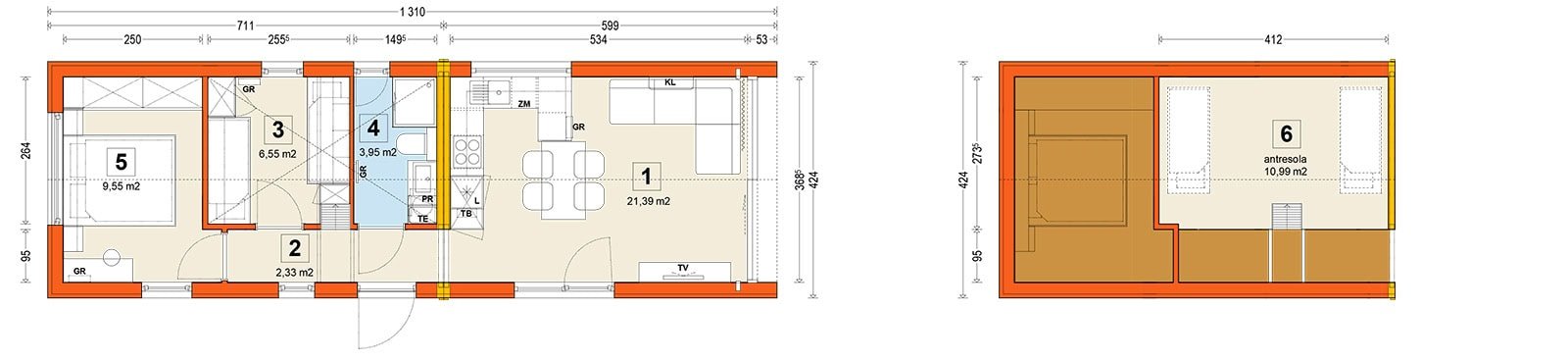 L’intérieur de la maison se divise en deux parties : un espace de vie – comprenant un salon ouvert sur une kitchenette en forme de U et un large couloir – et un espace nuit – avec une salle de bains et deux ou trois chambres. L’entrée se fait par la porte principale située dans le couloir central , d’où l’on accède aux différentes pièces. En face de l’entrée se trouvent un dressing et une buanderie . À droite, on longe l’espace de vie, et à gauche, le couloir mène à la chambre et à la salle de bains. Depuis le couloir, une échelle permet également d’accéder à la mezzanine.