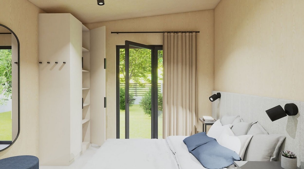 Cette maison modulaire en bois CLT de 32 m² habitables (43 m² de superficie totale) est une solution moderne et élégante pour créer un espace de détente au cœur de la nature. Compacte et fonctionnelle, elle dispose d’un seul niveau avec un toit plat, deux chambres, un salon avec cuisine ouverte et une salle de bains entièrement équipée.