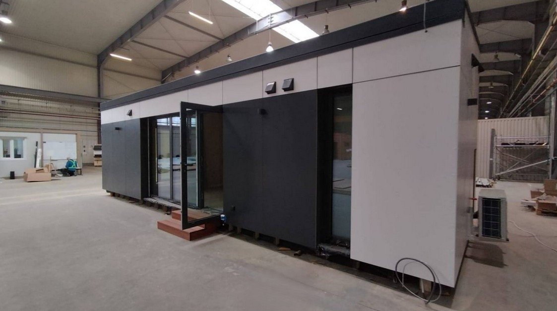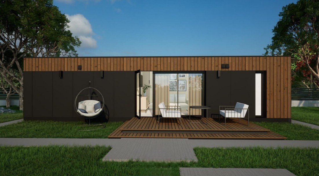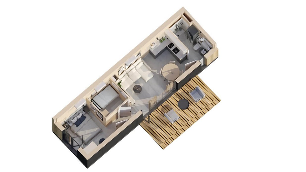 Maison modulaire en bois CLT moderne et durable, offrant 32 m² habitables sur un seul niveau. Idéale comme résidence de vacances, elle comprend 2 chambres, un salon avec cuisine, une salle de bains équipée et une isolation performante pour un confort toute l’année.