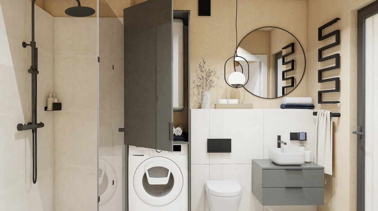 - Salle de bains complète : WC suspendu, douche, meuble avec vasque et robinetterie