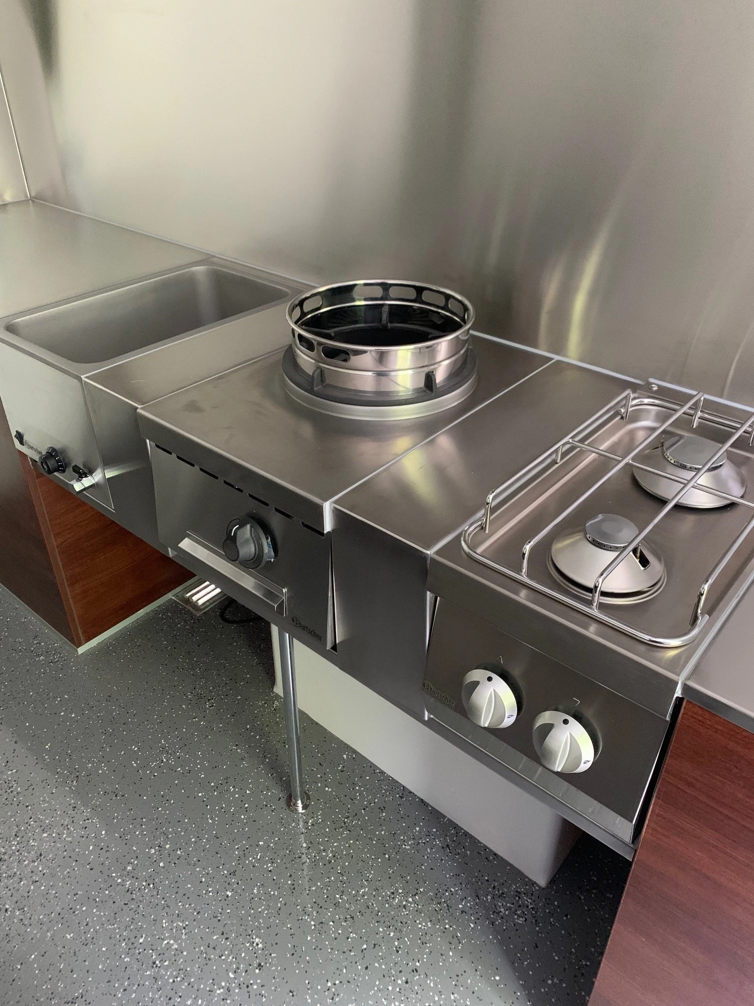 Au bas du meuble avec des bidons d’eaux fraîches et usées,